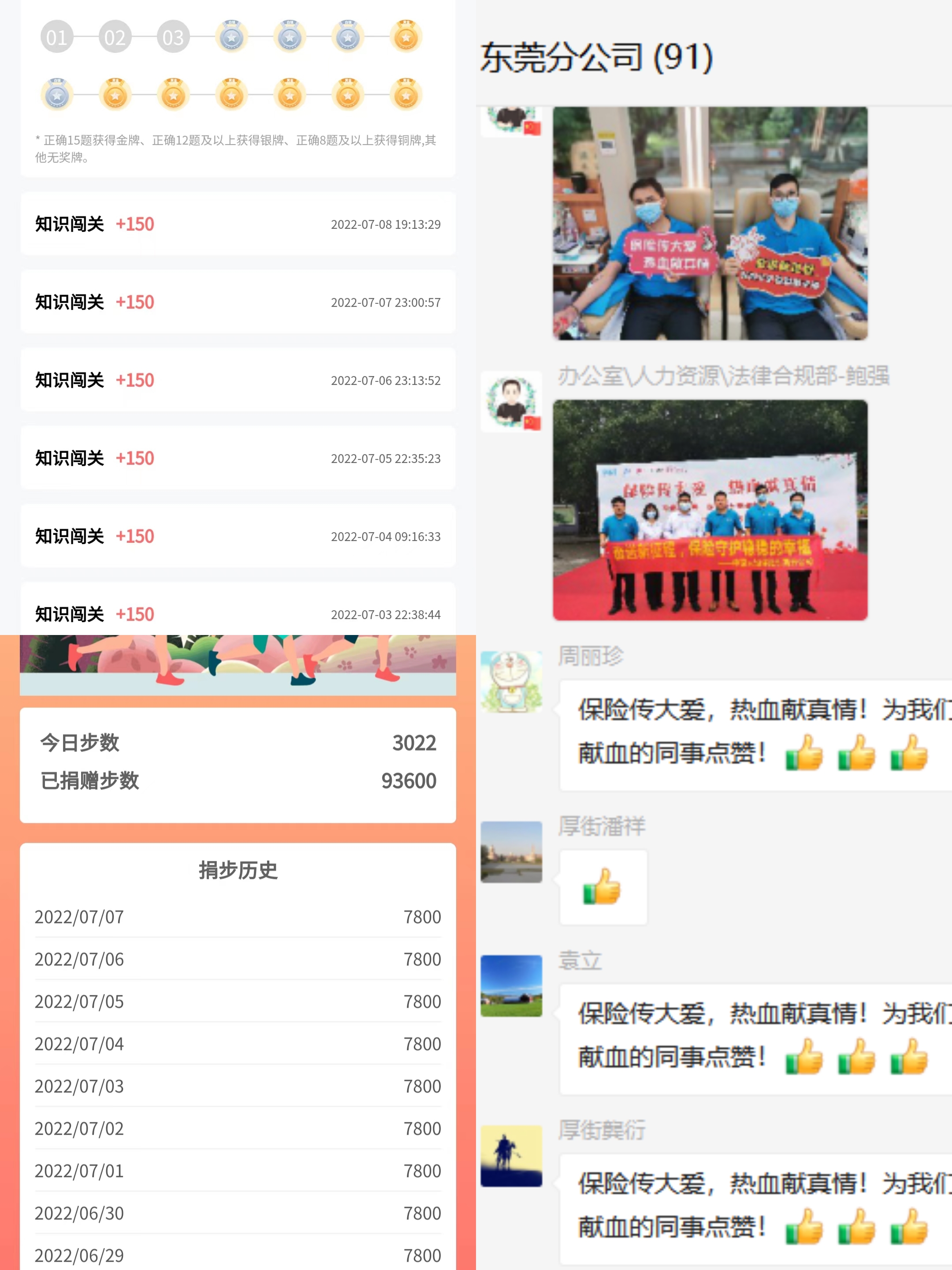 自6月25日起,東莞分公司認真組織分公司全體員工通過“線上+線下”,由分公司總經理室牽頭,各部門配合的方式,開展了“助推鄉村振興、服務老年群體”保險公益健步走活動及知識闖關活動,通過捐贈運動步數,宣傳保險知識,助推鄉村振興項目和保險助老公益項目,與全行業一起守護百姓穩穩的幸福。